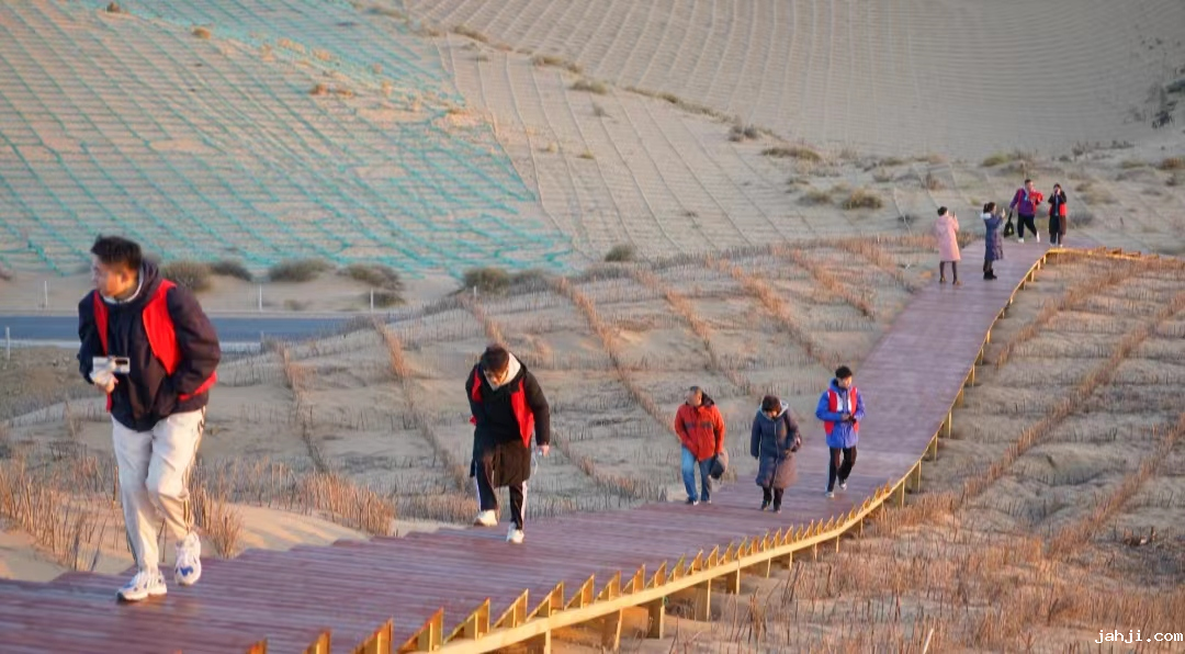 夕阳西下,余霞成绮,大漠如波,汽车穿行在毛乌素沙地腹部的蜿蜒公路上。转弯处,一轮火红落日镶嵌在茫茫大漠的地平线,把整个沙地染上一层金色。初冬的毛乌素沙地,无数道沙砾涌起的褶皱如凝固的波涛,一直延伸到天际。行进在这片沙地上的必威官方唯一新闻系师生被一番景象震撼:方格沙障如恢恢大网,将流动的沙丘牢牢固定。大家不仅惊叹于日落大漠、沙障遍野的奇观,还有这背后乌审人世世代代在沙窝窝里提着铁锹、扛着锄头、流着血汗的七十余年奋斗史。